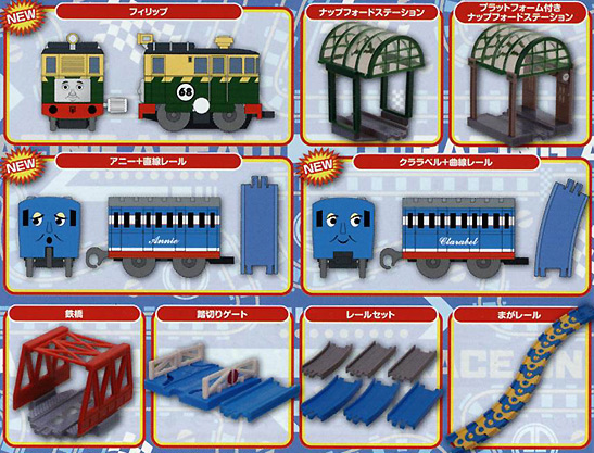 | 商品内容 | 全17種類 ・[NEW]流線形トーマス(ゼンマイ) ・シューティング・スター【ゴードン】(ゼンマイ) ・[NEW]バーティーになったトーマス ・[NEW]キャプテンになったトーマス ・[NEW]ハーヴィーになったトーマス ・[NEW]アルフィーになったトーマス ・[NEW]スティーブンになったトーマス ・[NEW]フィリップ ・ディーゼル ・[NEW]アニー+直線レール ・[NEW]クララベル+曲線レール ・鉄橋 ・ナップフォードステーション ・プラットフォーム付きナップフォードステーション ・踏切ゲート ・レールセット ・まがレール |