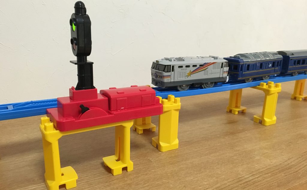 「信号機」に「ストップレール」の取り付けられるようになっていて、固定すると信号のスイッチで、「ストップレール」のスイッチが切り替わるようになります。