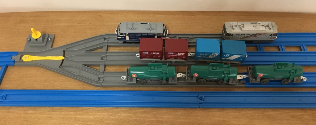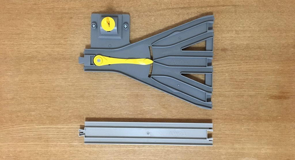 他のポイントレールは、逆からの入線(三線から一線への入線)でも、脱線することがありませんが、この「てんてつき」は、逆からの入線時にポイントをちゃんと合わせておかないと脱線します。