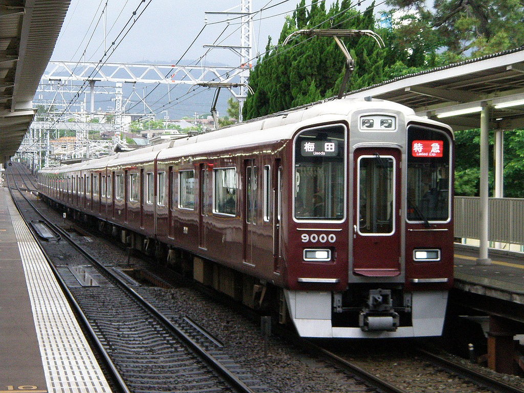 阪急電鉄9000系は、2006年より神戸・宝塚線用に製造した阪急電鉄の電車です。京都線用の9300系と基本的なデザインは変わりませんが、神戸・宝塚線用に規格をあわせて、全長が100mm長く、全幅が50mm短くなっています。また、座席は9300系のドア間が転換・固定式クロスシートであるのに対し、9000系はロングシートとなっています。種別・行先表示器は、阪急電鉄で初めてフルカラー式LEDを採用しました。