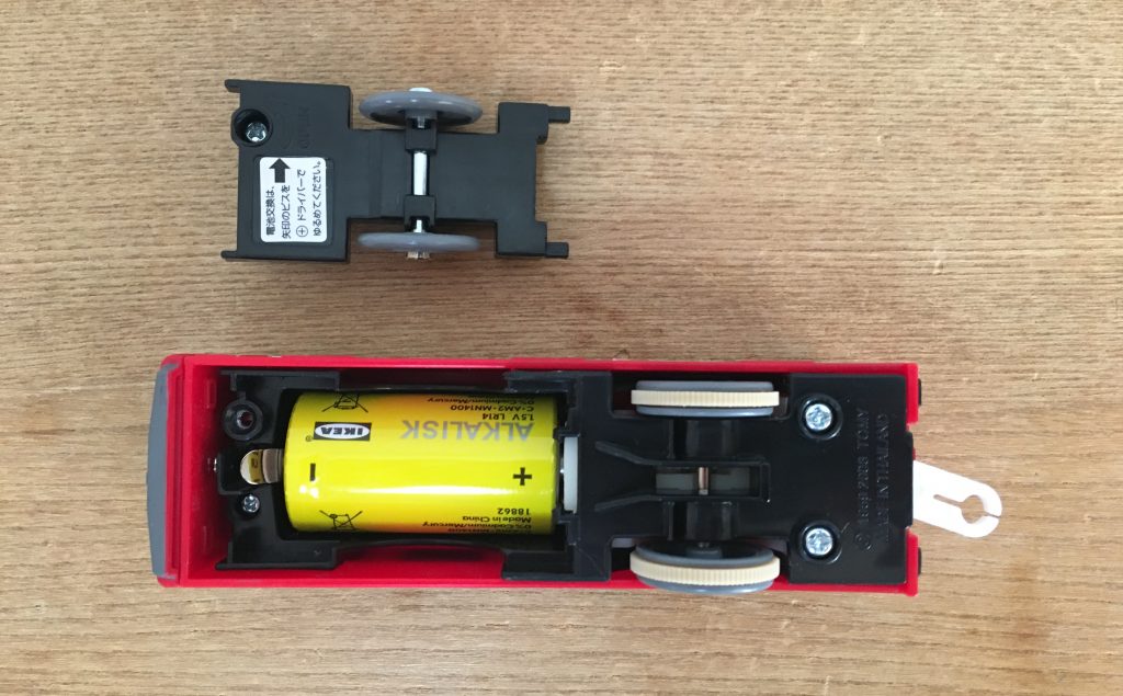 電池は単2電池で、車体裏からドライバーで電池を交換します。