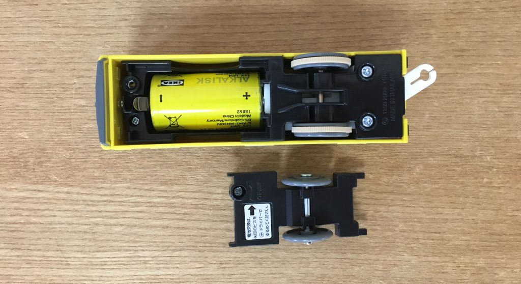 電池は単2電池で、車体裏からドライバーで電池を交換します。