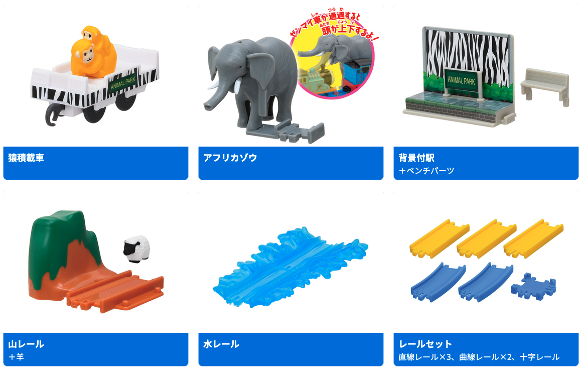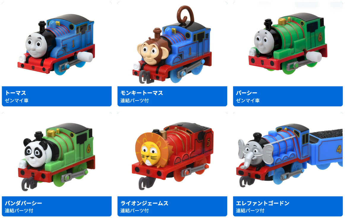 | 商品内容 | 全12種類 ・トーマス(ゼンマイ車) ・モンキートーマス(連結パーツ付) ・パーシー(ゼンマイ車) ・パンダパーシー(連結パーツ付) ・ライオンジェームス(連結パーツ付) ・エレファントゴードン(連結パーツ付) ・猿積載車 ・背景付駅+ベンチパーツ ・山付きレール+羊 ・アフリカゾウ ・水レール ・レールセット(直線レール×3+曲線レール×2+十字レール×1) |
