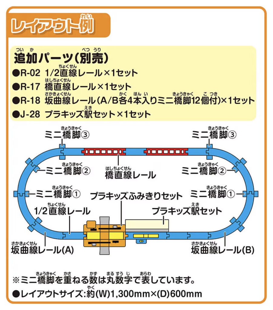 | セット内容 | ふみきり本体(1)、警報機(2)、スロープ(2)、プラキッズ(プラくん、ライちゃん)(2)、シール(1)、部品注文書(1) |