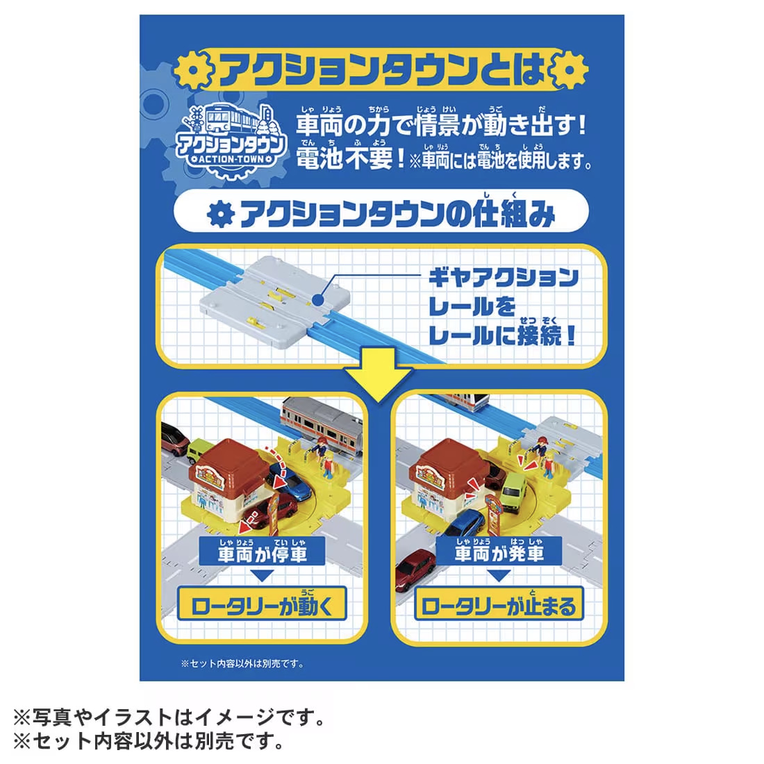 商品詳細 ・電池不要!車両の力で情景が動き出す!アクションタウンのぐるぐるドライブスルーが登場! 車両が到着するとロータリーのトミカが自動でショップをぐるぐるまわる!看板もぐるぐるまわる! 付属のギヤアクションレールは1/2直線レールサイズでレイアウトも組みやすい!キミだけの動き出す街を作ろう!