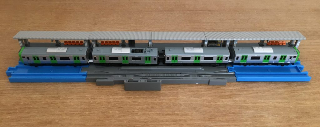 この商品の駅をつなげると「直線レール」2本分となり、アドバンス車両4両を停車させることができます。