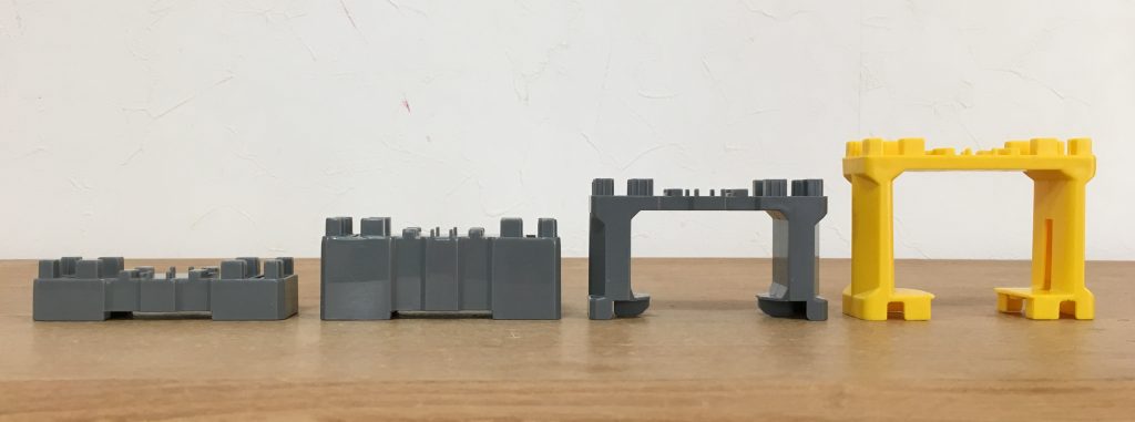 上の写真は、右から「橋脚1」「橋脚2」「橋脚3」「ブロック橋脚(プラレール用)」となっています。