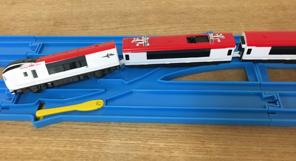 ポイントの黄色いレバーは、とても軽く動きやすいので、ちょっとした衝撃でポイントが意図していない方向へ切り替わってしまいます。