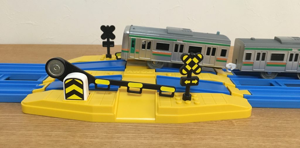 この「複線踏切」は、音やライトなどのギミックはありませんが、車両通過時に、車両の重さで遮断機が下りてくるようになっています。