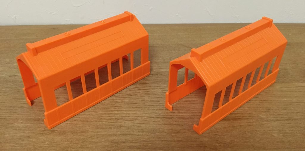 置くだけで、車庫にできる便利な情景ですが、オレンジというカラーリングが安っぽさをだして、レイアウトの中でも浮きます。