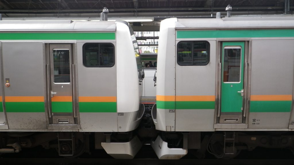 E231系とE233系で微妙に帯びの色が違う(左:E231系の中間車、右:E233系の中間車)